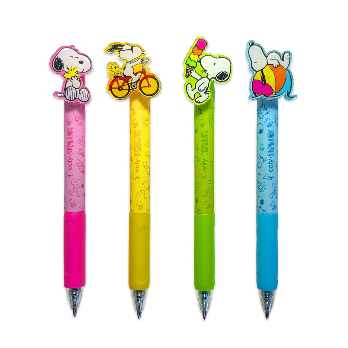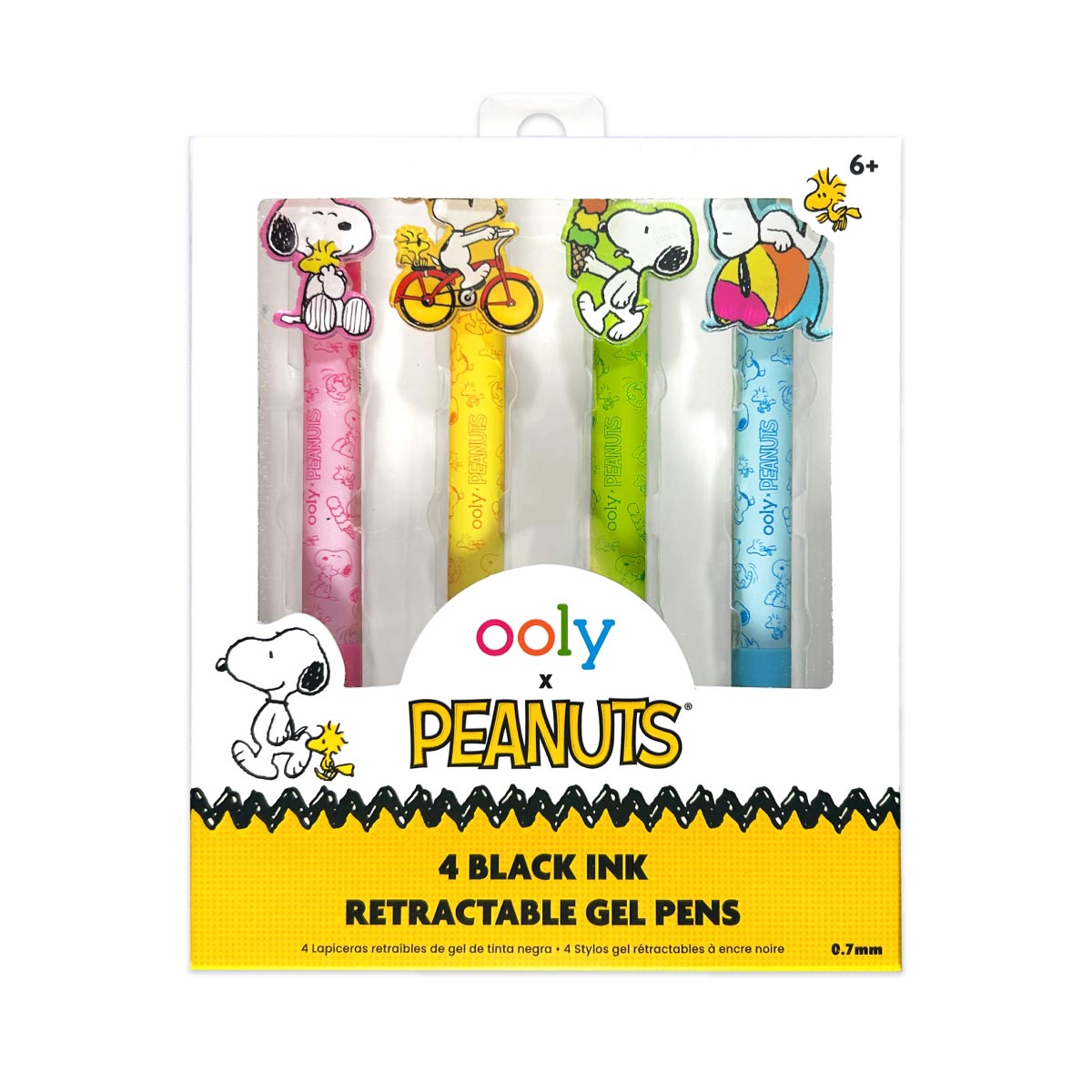 Un set de 4 bolígrafos en tinta gel negra con 4 escenas divertidas de Snoopy: