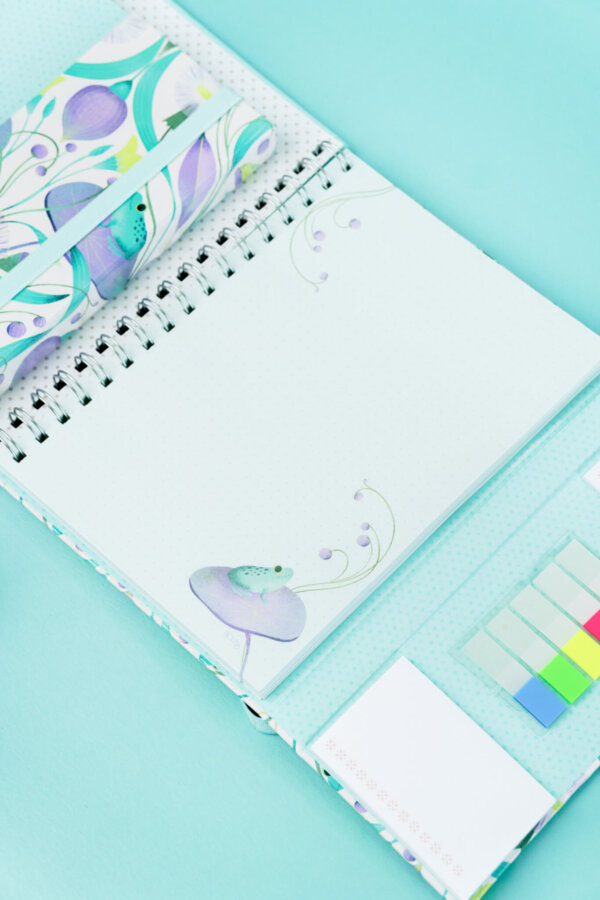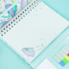 El cuaderno perfecto para la oficina o como cuaderno escolar, agenda, para hacer bullet journal; o simplemente, tomar notas increíbles. Viene con sus hojitas decoradas, banderines, taco de notas y stickers divinos.