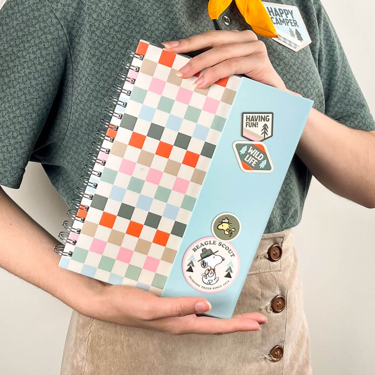 Su portada está inspirada en los parches clásicos de campamento, con estampillas llenas de aventura y la ternura inconfundible de Snoopy.