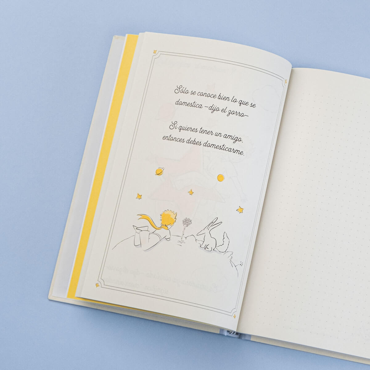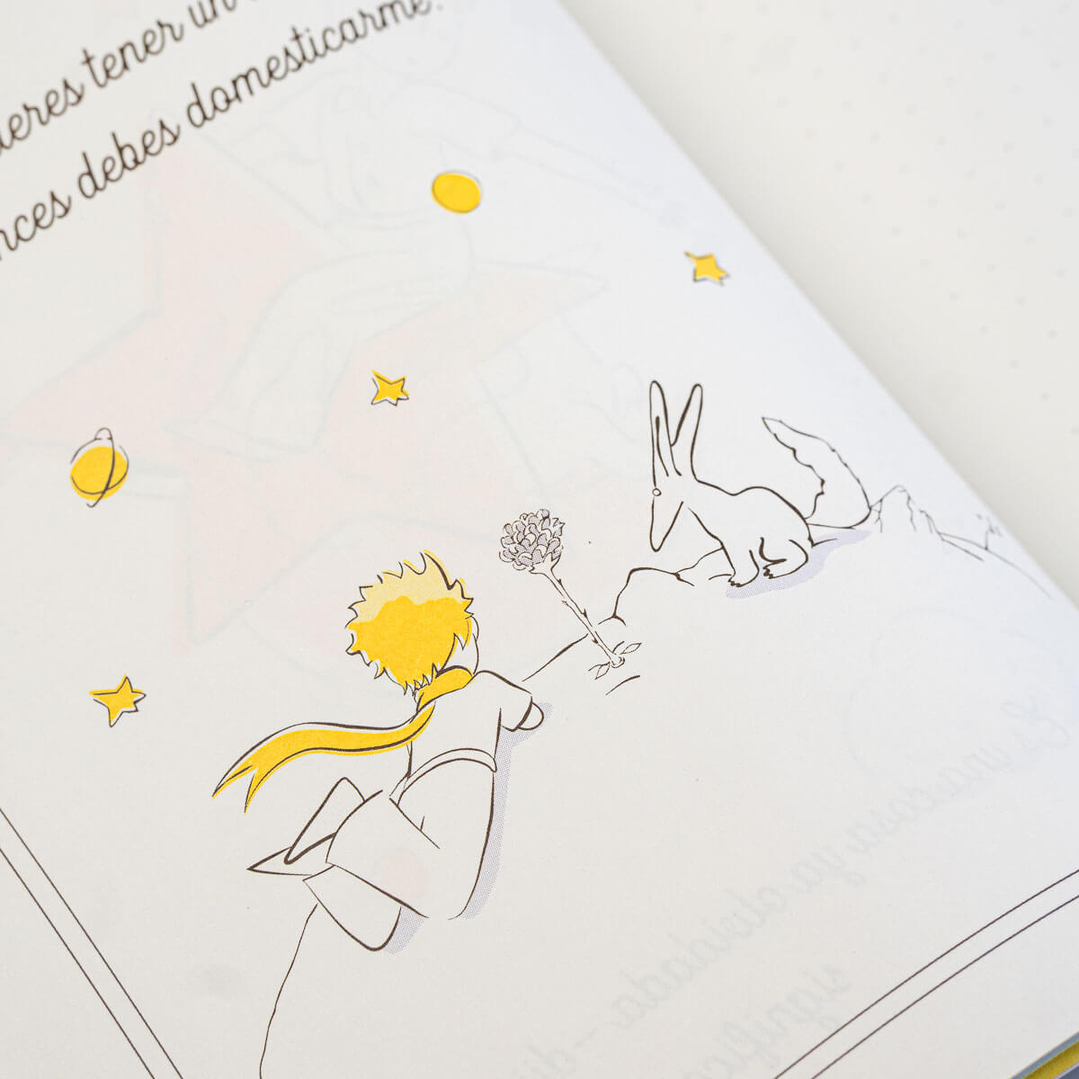 Sus 80 hojas punteadas a dos tintas te invitan a escribir, dibujar o planear a tu manera. Además, incluye separadores internos con ilustraciones y frases del libro, que te recordarán, cada vez que la abras, que “lo esencial es invisible a los ojos.”