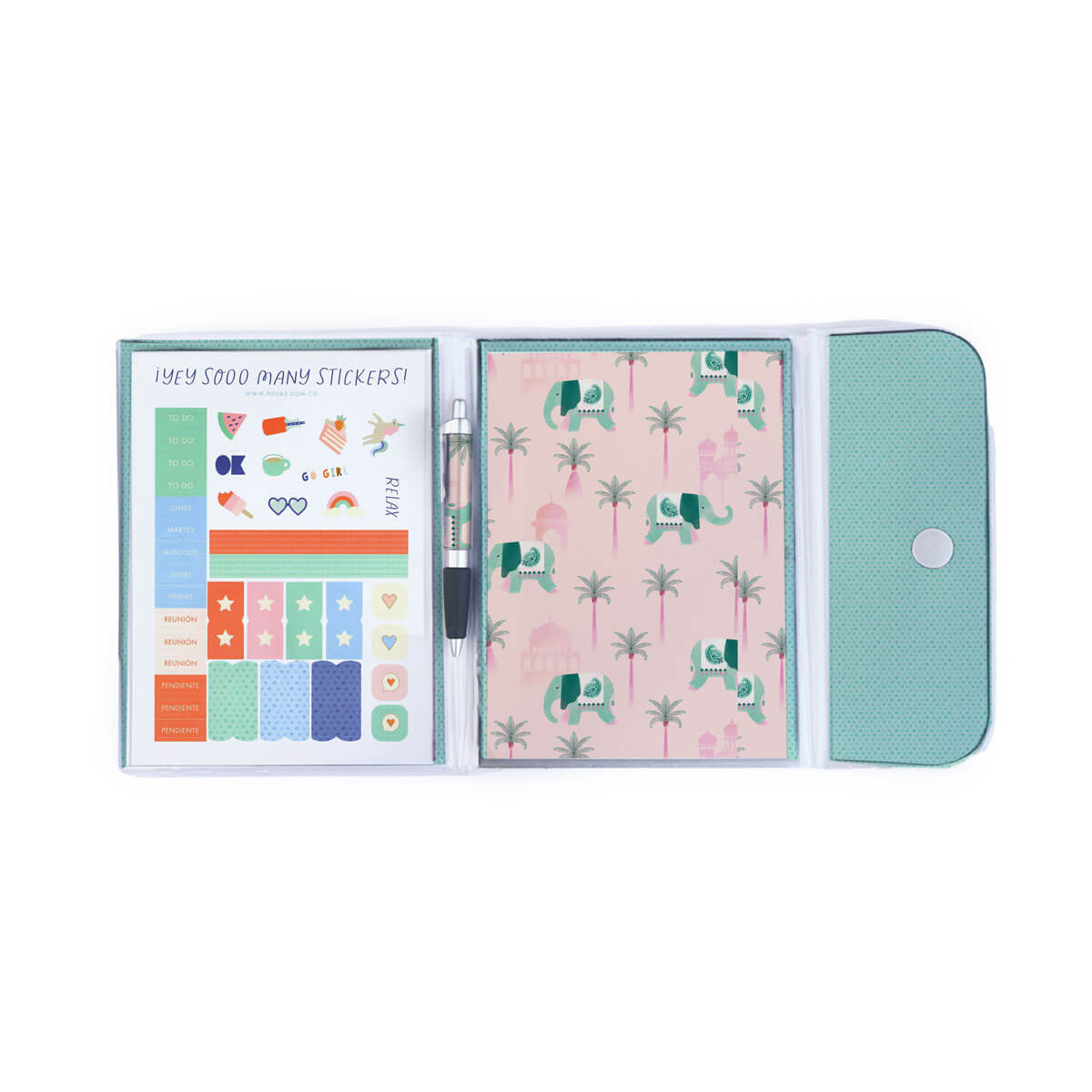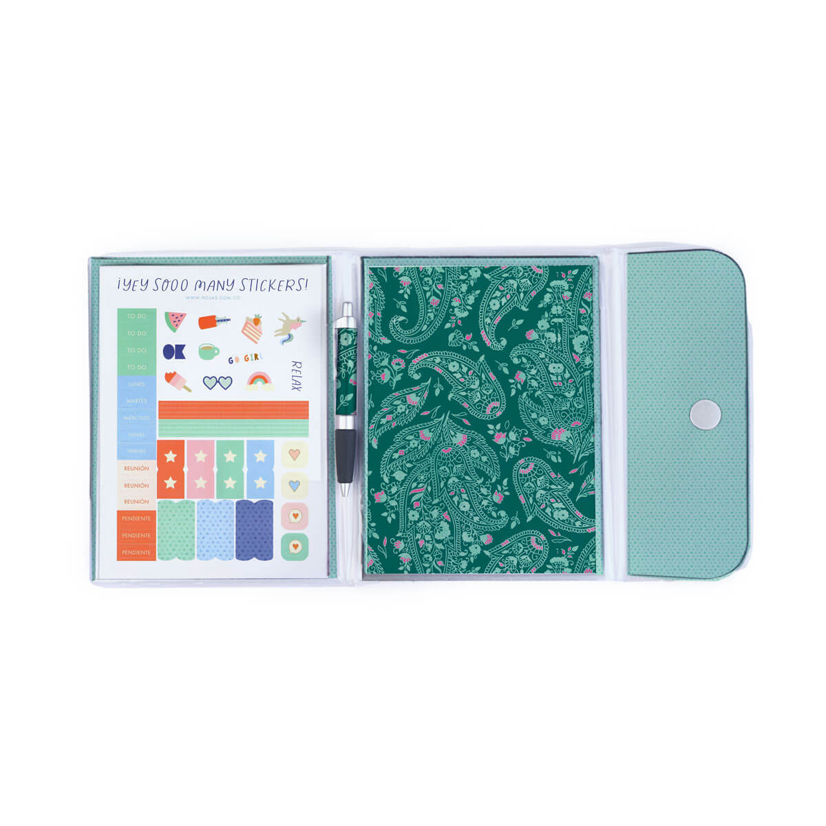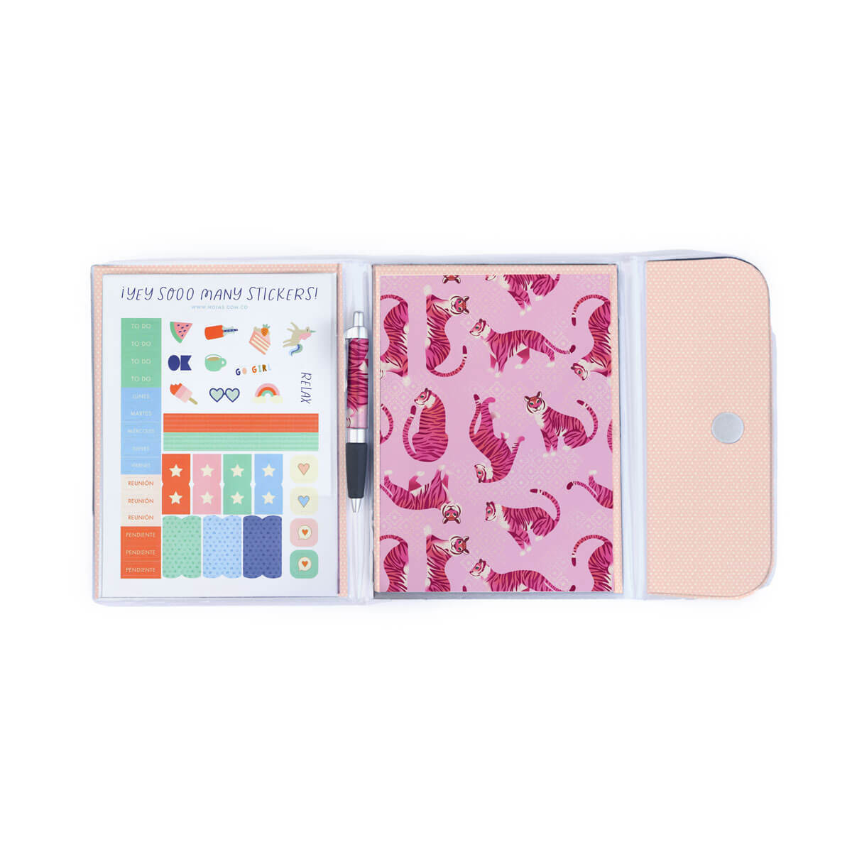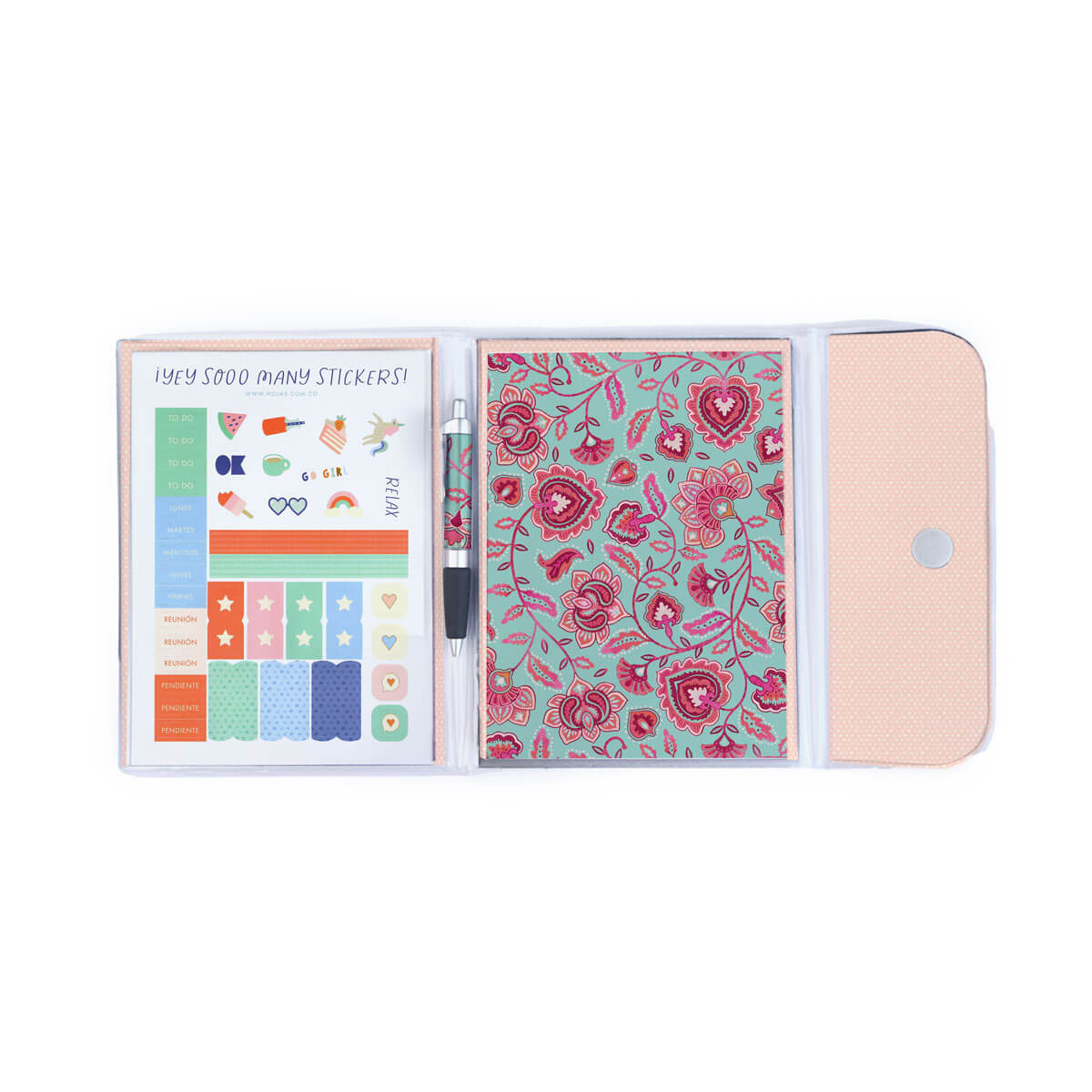 El kit de escritura que necesitas. Ideal para llevar tus notas súper cómodas, con bolígrafo compañero para que no se te escape ningún dato y carpeta termosellada que cierra con velcro. Un 4 en 1 que te acompañará en los diseños de la última colección. Además, puedes cambiar el block de hojas cuando quieras.