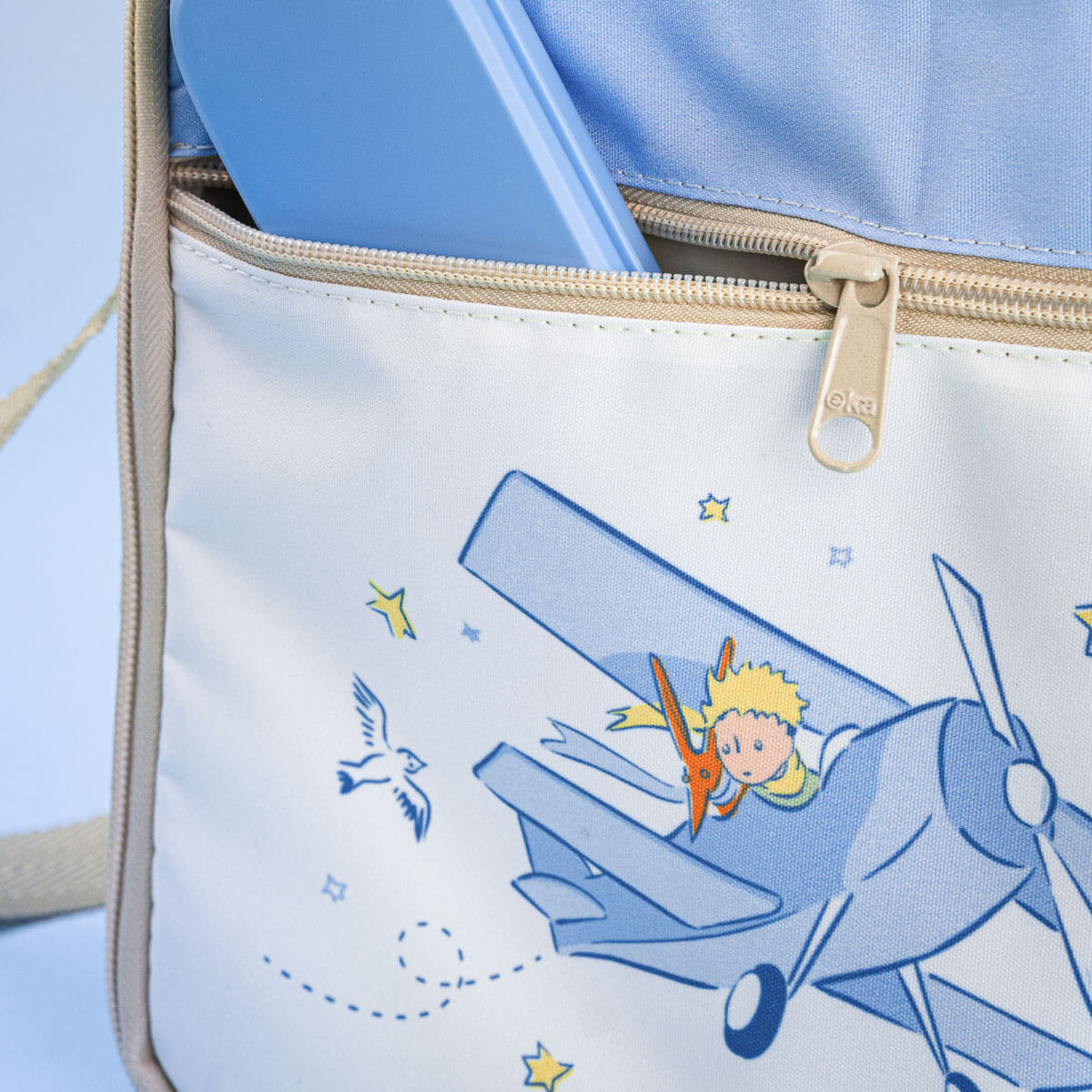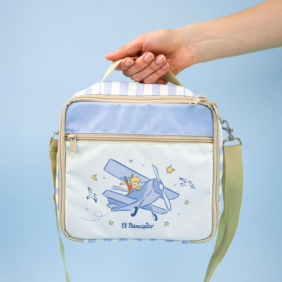 El Principito cuidará de tu almuerzo con esta hermosa lonchera cuadrada, semi impermeable, con interior térmico y correa ajustable para llevarla cómodamente a donde vayas.