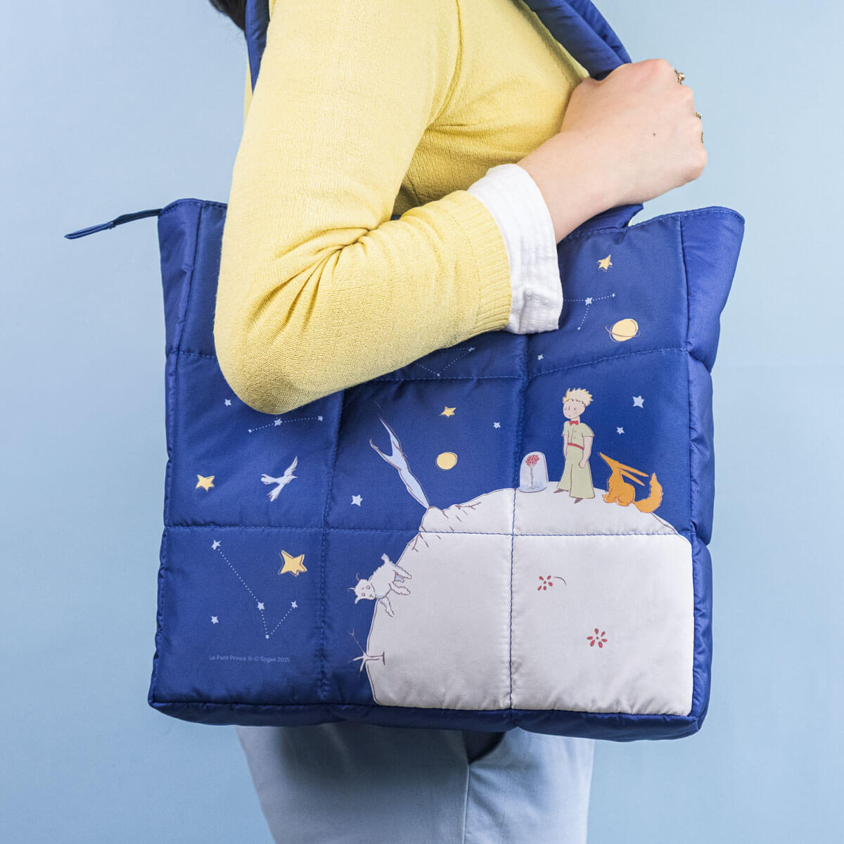 La Puffer Bag El Principito x Hojas combina estilo, funcionalidad y un toque de fantasía en un diseño inspirado en las estrellas, los planetas y los viajes del pequeño explorador.